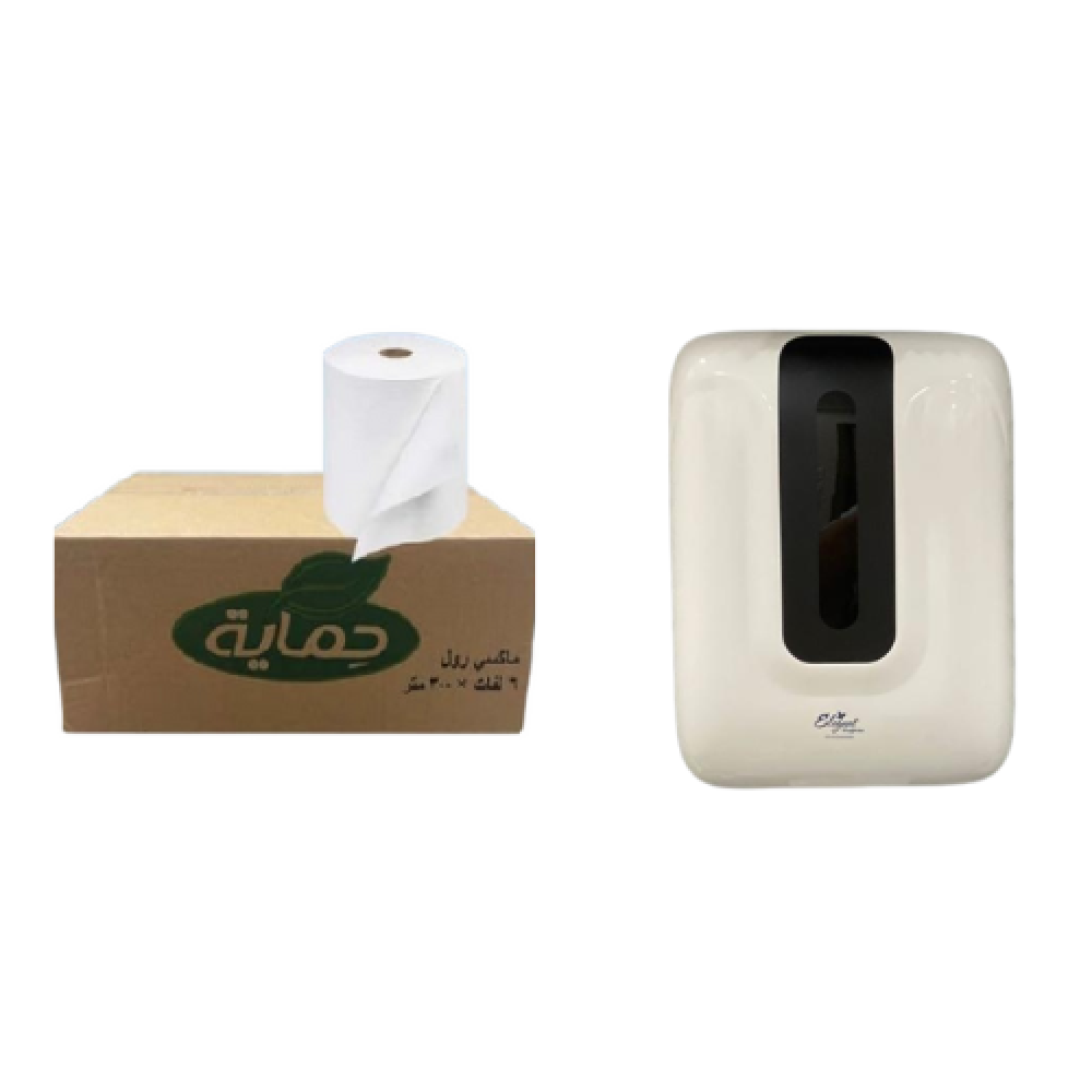 موزع مناديل ماكسي رول ابيض وفي المنتصف اسود + كرتون مناديل ماكسي رول عباره عن 6 رول